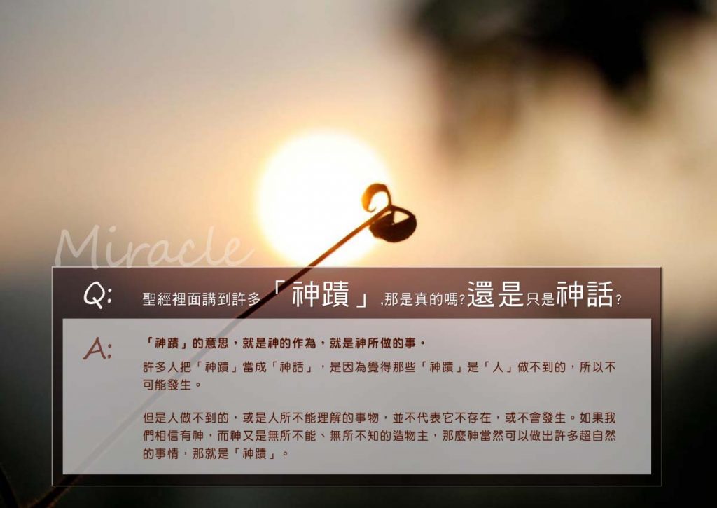 許多人把「神蹟」當成「神話」,是因為覺得那些「神蹟」是「人」做不到的,所以不可能發生。