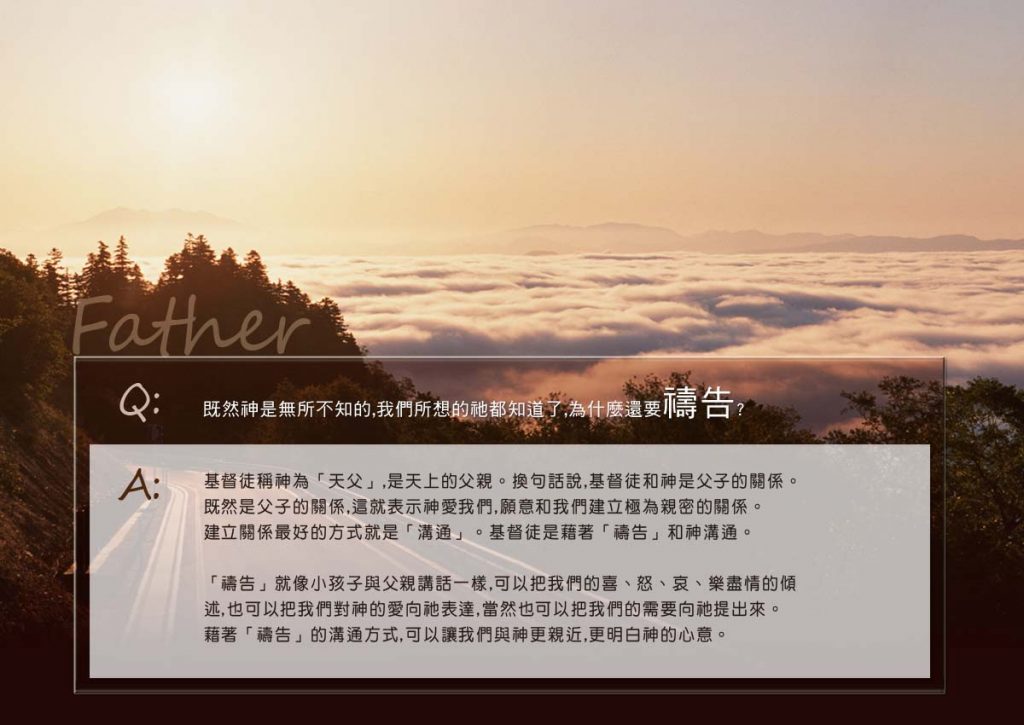 「禱告」就像小孩子與父親講話一樣,可以把我們的喜、怒、哀、樂盡情的傾述,也可以把我們對神的愛向祂表達,當然也可以把我們的需要向祂提出來。藉著「禱告」的溝通方式,可以讓我們與神更親近,更明白神的心意。