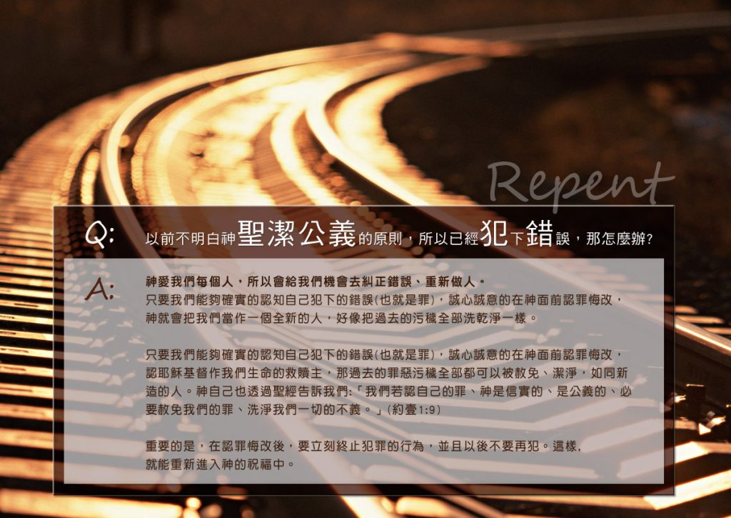 只要我們能夠確實的認知自己犯下的錯誤(也就是罪),誠心誠意的在神面前認罪悔改,神就會把我們當作一個全新的人,好像把過去的污穢全部洗乾淨一樣。