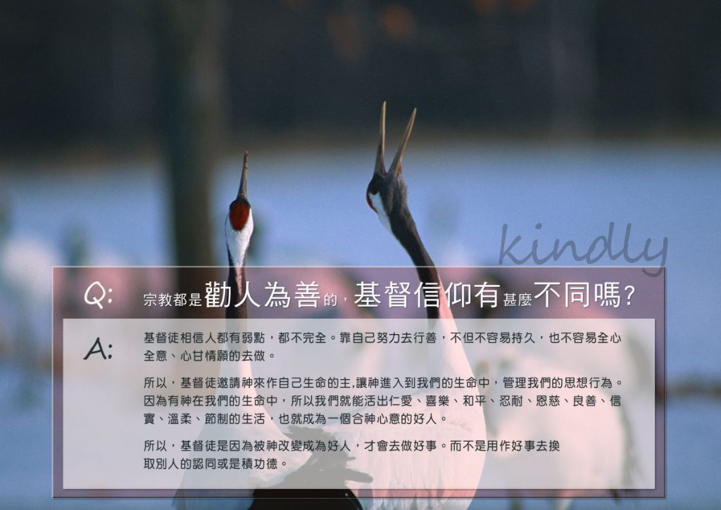 所以,基督徒是因為被神改變成為好人,才會去做好事。而不是用作好事去換取別人的認同或是積功德。