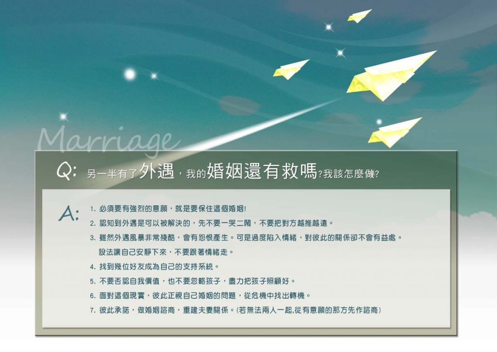 1. 必須要有強烈的意願,就是要保住這個婚姻!2. 認知到外遇是可以被解決的,先不要一哭二鬧,不要把對方越推越遠。3. 雖然外遇非常殘酷,會有怨恨。可是過度陷入情緒,對彼此的關係卻不會有益處。。4. 找到幾位好友成為自己的支持系統。5. 不要否認自我價值,也不要忽略孩子,盡力把孩子照顧好。6. 面對這個現實,彼此正視自己婚姻的問題,從危機中找出轉機。7. 彼此承諾,做婚姻諮商,重建夫妻關係。(若無法兩人一起,從有意願的那方先作諮商)