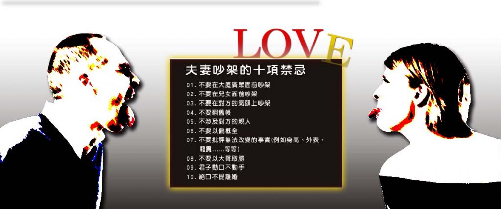 1. 不要在大庭廣眾面前吵架。2. 不要在兒女面前吵架。3. 不要在對方的氣頭上吵架。4. 不要翻舊帳。5. 不涉及對方的親人。6. 不要以偏概全。7. 不要批評無法改變的事實(例如身高、外表、籍貫……等等)。8. 不要以大聲取勝。9. 君子動口不動手。10. 絕口不提離婚。