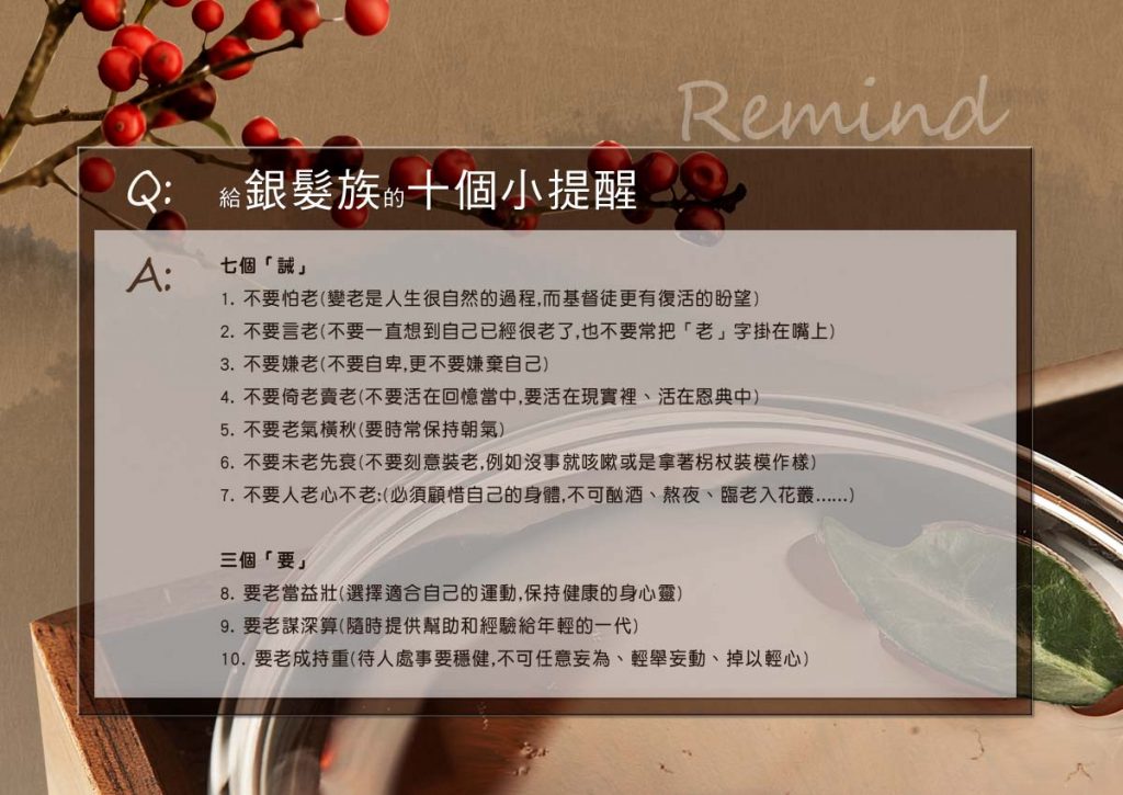 8. 要老當益壯。9. 要老謀深算(隨時提供幫助和經驗給年輕的一代)。10. 要老成持重。